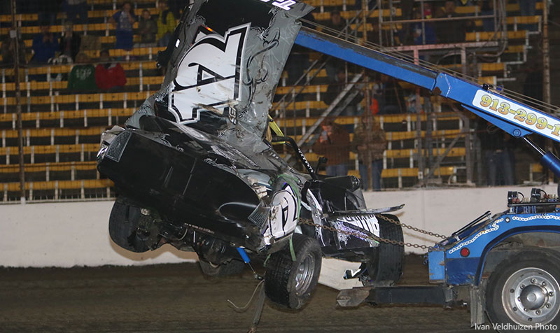 Another caution occurred on lap 16 when Scotty Moore suffered a big crash while racing in the top five. Moore’s machine got turned toward the fence underneath the flagstand, and then barrel-rolled no less than six times down the front-stretch catch fence. Thankfully, he was able to walk away.
