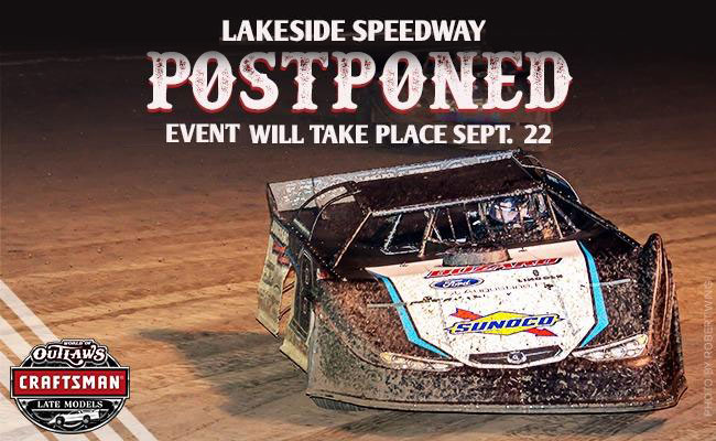 Due to heavy persistent rain hitting the Kansas City area over the past several days which has brought excessive localized flooding, the World of Outlaws Craftsman Late Model Series has postponed this week's event at the Lakeside Speedway to Friday, Sept. 22.